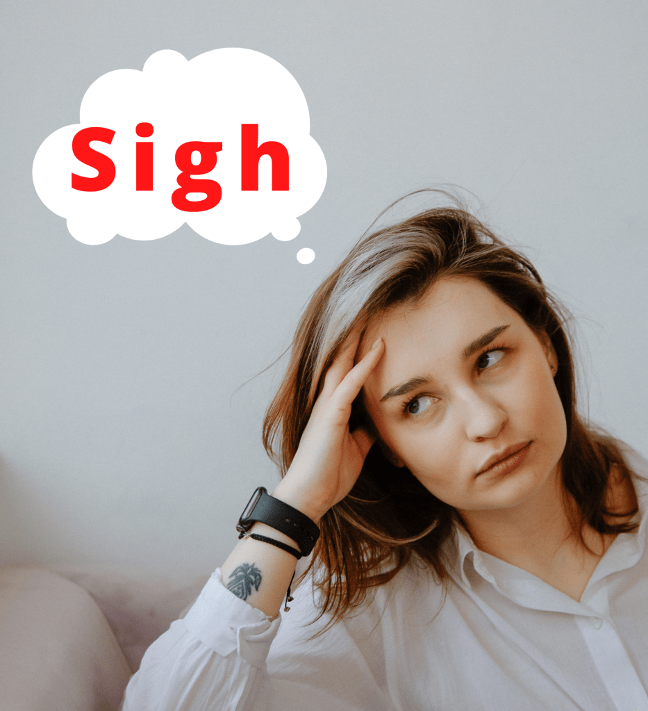 Sighing is an audible and visual reaction. But maybe a first-person character would only observe this in others. Would a first-person character just express the frustration in dialogue (internal and audible) and in physical actions?
